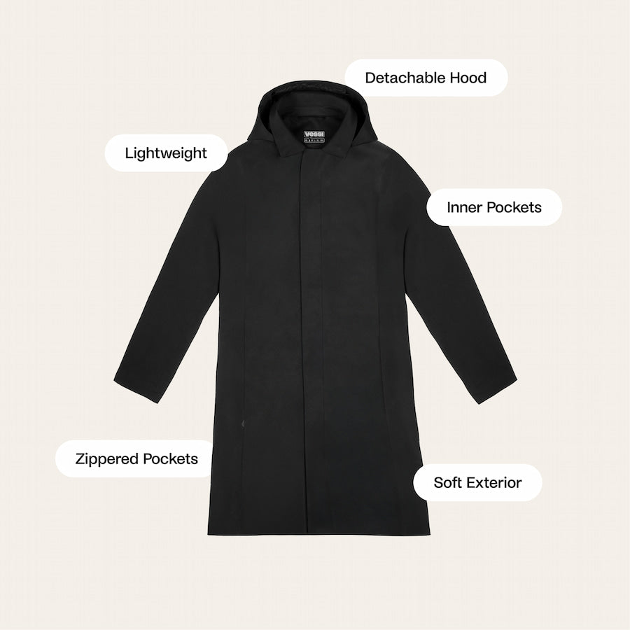 A modern trench with waterproof comfort.This is a long rain jacket with clean and crisp tailored details featuring unexpectedly soft lightweight and breathable vegan materials. Made with Dyma-tex® 100% waterproof technology this versatile coat easily transitions from basic commute to night on the town.