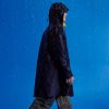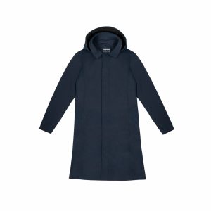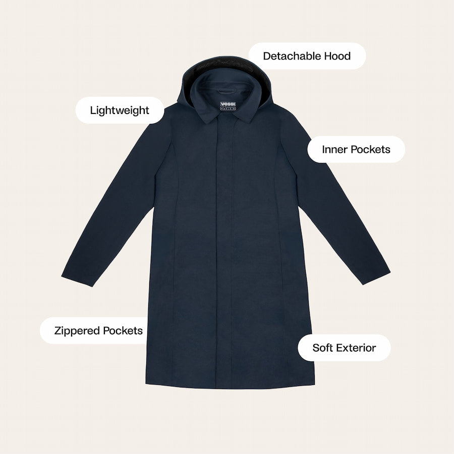A modern trench with waterproof comfort.This is a long rain jacket with clean and crisp tailored details featuring unexpectedly soft lightweight and breathable vegan materials. Made with Dyma-tex® 100% waterproof technology this versatile coat easily transitions from basic commute to night on the town.